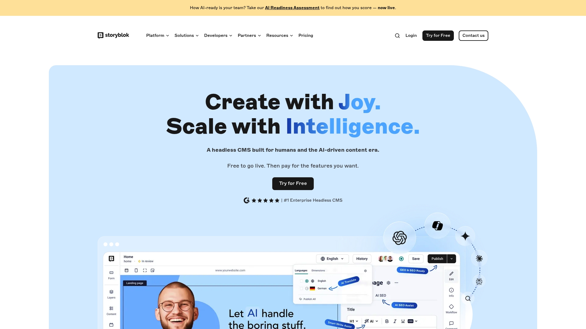Storyblok è un CMS headless pensato per team che vogliono gestire contenuti con flessibilità e funzioni AI integrate. Offre editing visivo per i marketer e un'architettura API-first che facilita l'integrazione con front end moderni.