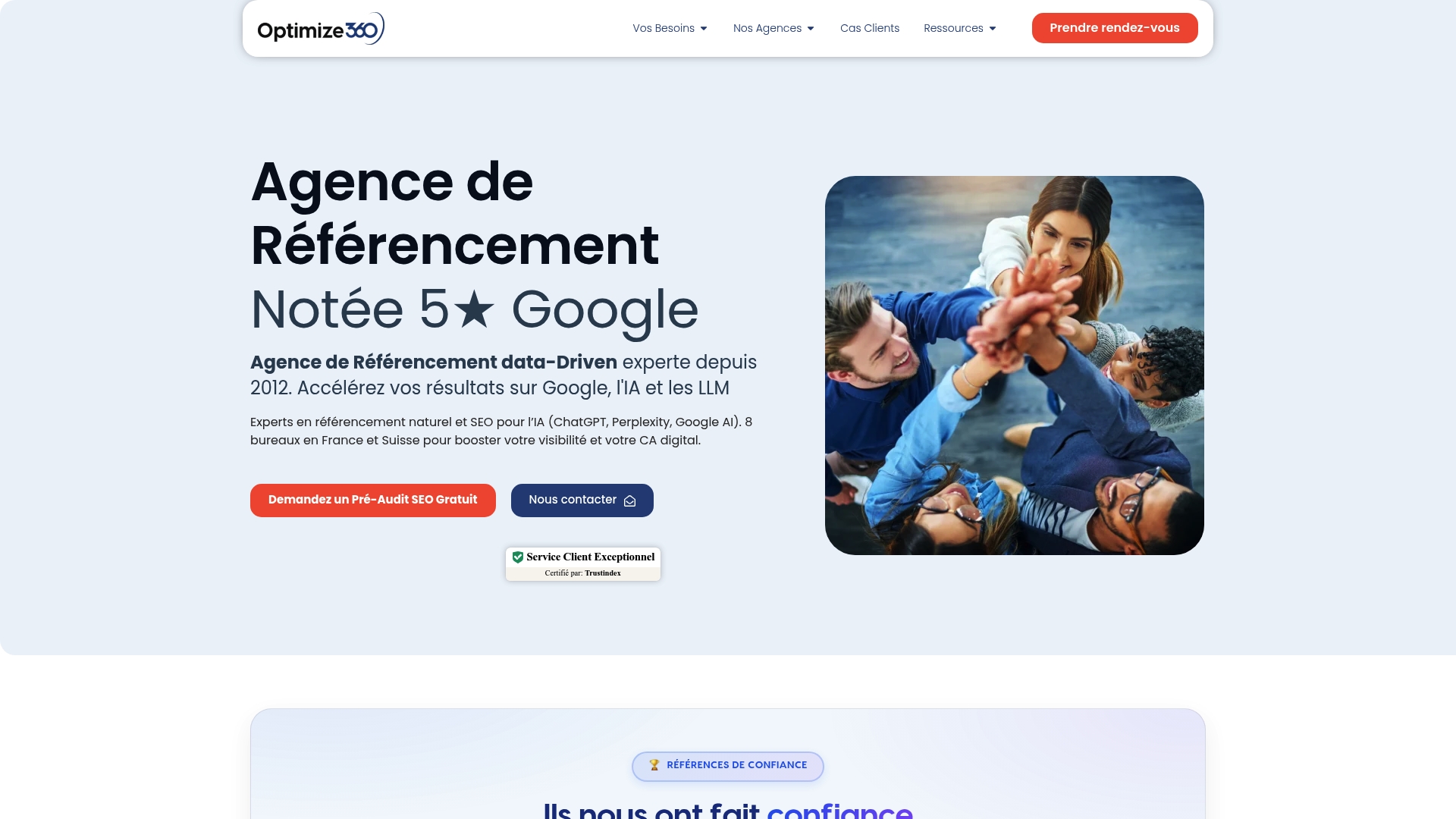 Optimize 360 est une agence SEO data-driven, notée 5 étoiles sur Google, active depuis 2012 avec 8 bureaux en France et en Suisse. Elle combine audit technique, optimisation sémantique et intégration d'IA/LLM pour booster la visibilité sur Google et les moteurs génératifs. Résultat annoncé : +60% de trafic en 6 mois pour des clients ciblés, ce qui en fait une option sérieuse pour les PME prêtes à investir. Bref : solide, technique et orientée résultats.