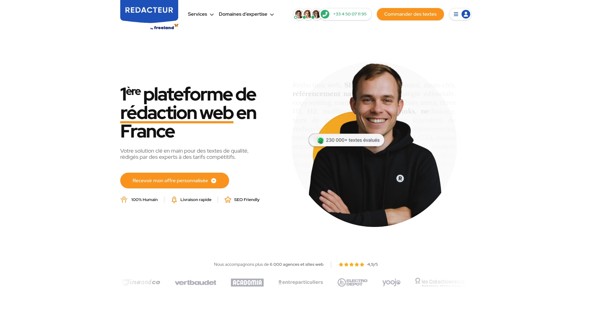 Redacteur.com est une plateforme française de rédaction web qui s'appuie sur des rédacteurs experts pour livrer des contenus SEO-friendly en français, et accompagne plus de 6 000 agences et sites web. Sa force : une offre clé en main qui couvre fiches produits, articles, pages et publications sociales avec un suivi humain via un chef de projet. Pour un propriétaire de PME à Caen cherchant à automatiser sa production de contenu sans multiplier les outils techniques, c'est une solution pragmatique et orientée résultat. Mais attention : certaines prestations nécessitent un échange soutenu et les tarifs sont souvent personnalisés.