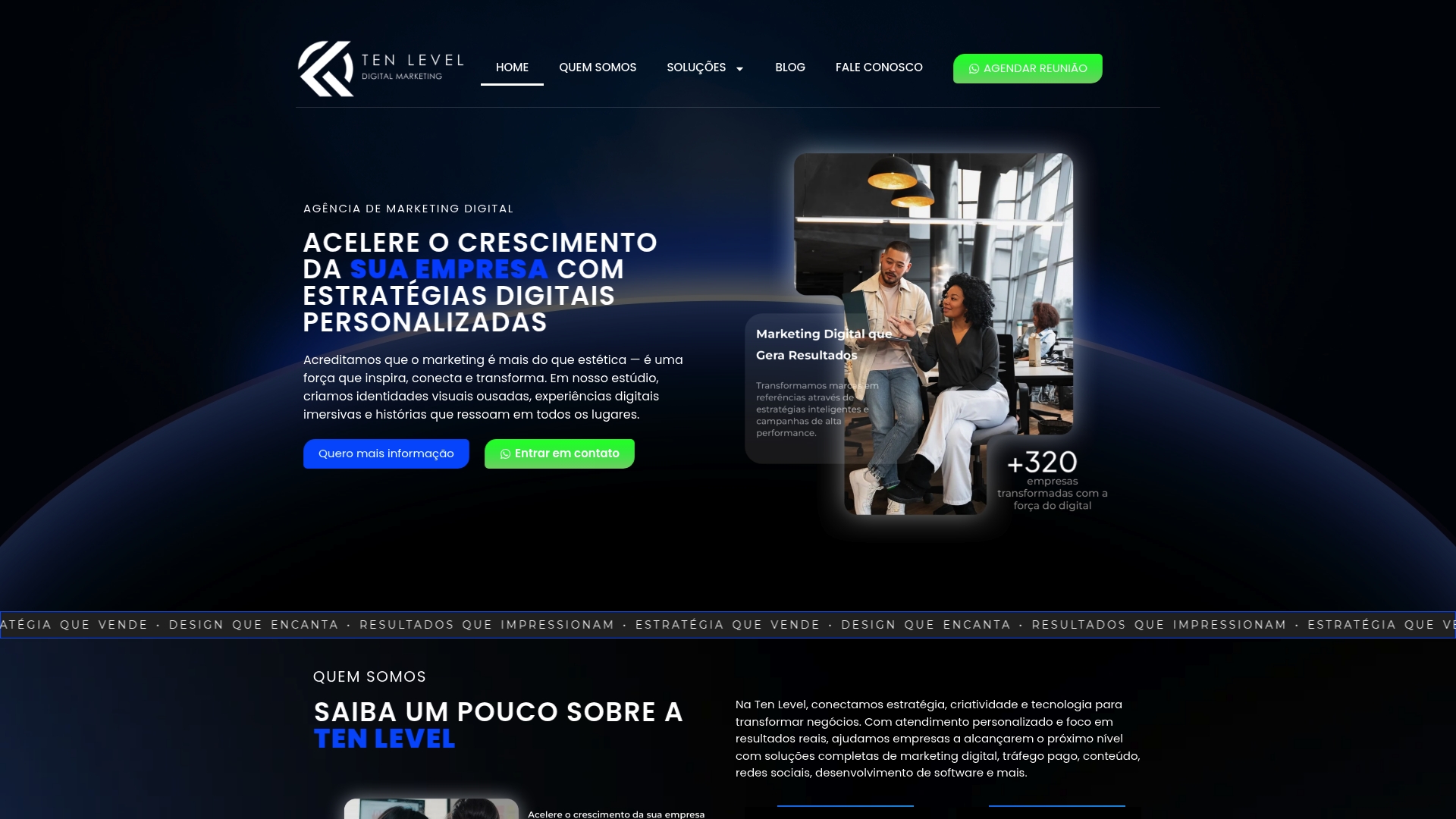 Ten Level apresenta-se como uma agência de marketing digital completa que junta estratégia, criatividade e tecnologia para resultados práticos. Oferece serviços desde Desenvolvimento de sistema a SEO e Marketing Orgânico com atendimento personalizado e diagnóstico gratuito. Para empresas de pequeno e médio porte que procuram uma solução integrada, é uma opção coerente. A transparência sobre preços, no entanto, fica a faltar.