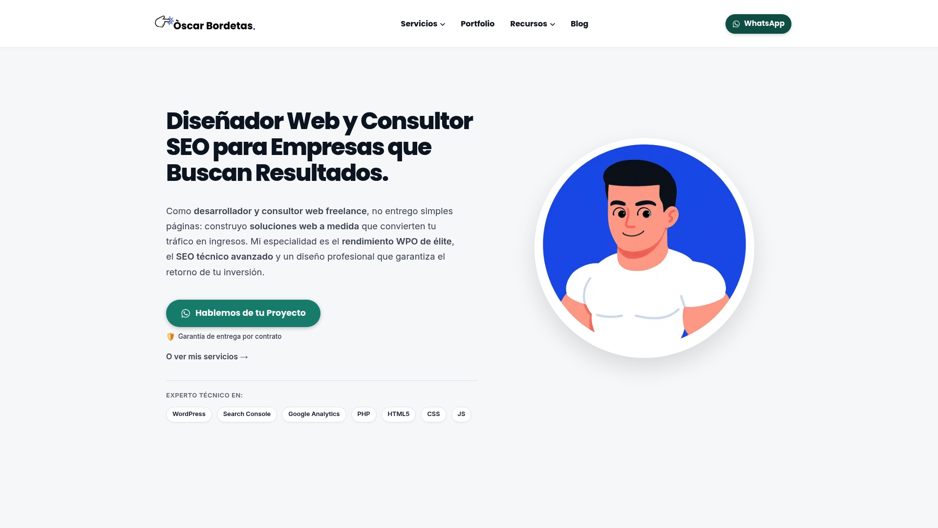 Óscar Bordetas ofrece desarrollo web y consultoría SEO con un enfoque artesanal y técnico pensado para empresas que necesitan un activo digital sólido. Su promesa de rendimiento —garantía de entrega en 14 días o reembolso completo con garantía de rendimiento (+95 en PageSpeed)— lo convierte en una opción atractiva para proyectos que exigen velocidad y fiabilidad. No es una solución low-cost: es una inversión dirigida a quienes buscan resultados medibles y propiedad total del código.
