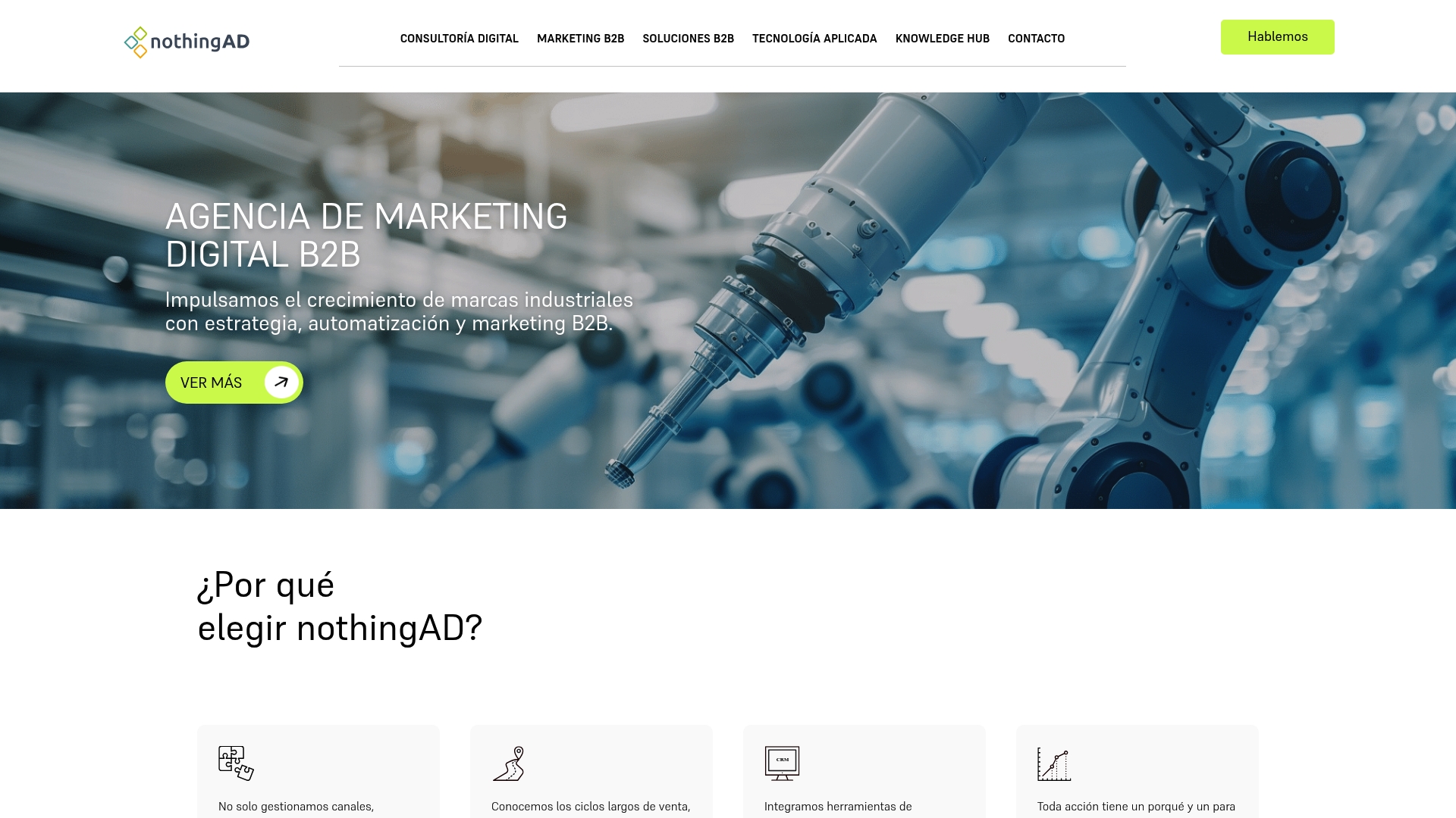 Nothingad es una agencia digital especializada en marketing B2B e industrial que apuesta por la estrategia, la automatización y la integración de AI para generar resultados sostenibles. Su enfoque está claramente orientado a procesos largos de venta y a alinear marketing con ventas para obtener leads cualificados. Si buscas una solución estratégica y técnica más que una campaña puntual, Nothingad merece consideración. No es la opción más evidente para modelos B2C o proyectos sin necesidades de automatización.