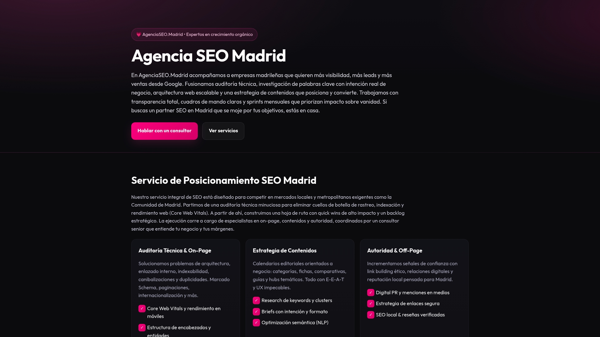 | Agencia SEO Madrid | Planificación estratégica en sprints. | Procesos claros y transparentes; enfoque en resultados. | Implica altos compromisos de coordinación cliente-agencia. | Bajo consulta |