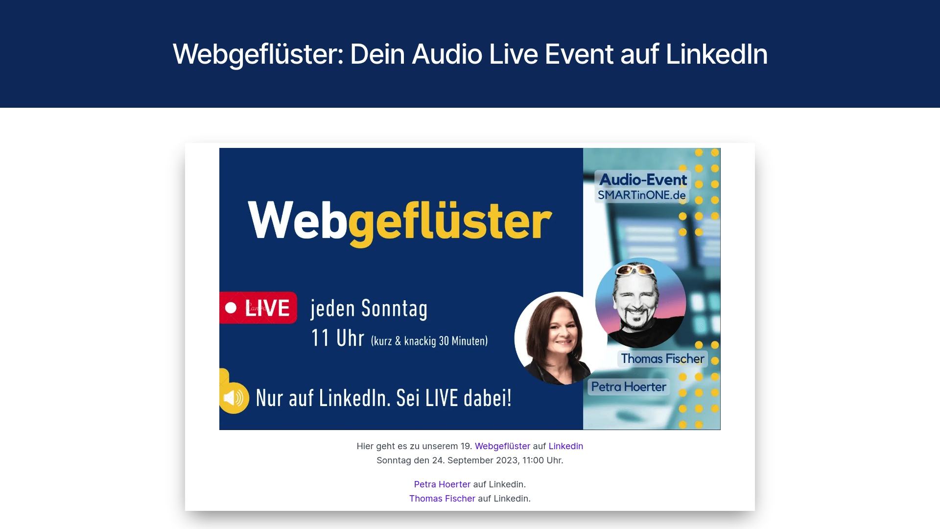 | webgeflüster | Live-Audio-Events auf LinkedIn | Direkte Audio-Interaktion, Gastsprecher-Unterstützung | Keine Preisangaben, begrenzte Funktionseinblicke | Keine Angaben |