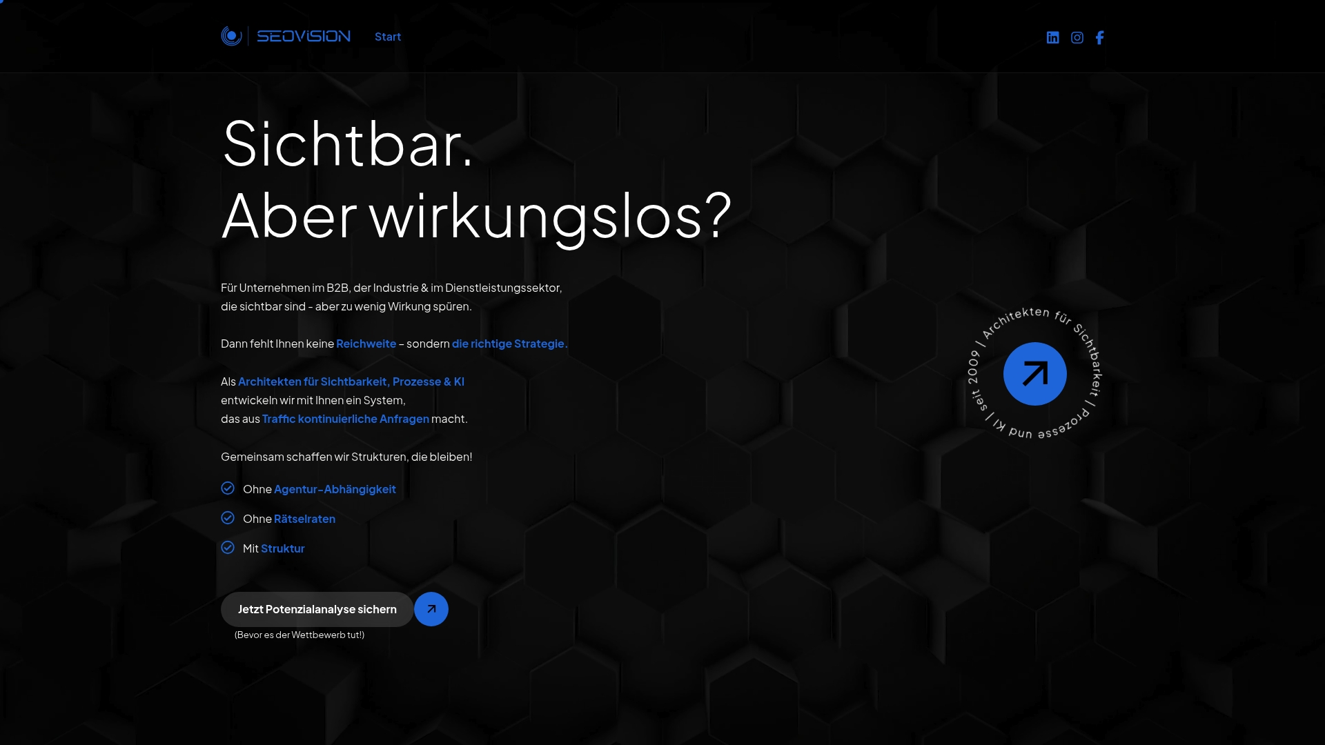 Seovision richtet sich an B2B-Unternehmen und Industrie-Firmen, die bereits sichtbar sind, aber mit der Wirksamkeit ihrer Maßnahmen unzufrieden sind. Wenn Sie bereit sind, in strategische Prozesse, Wissenstransfer und langfristigen Aufbau zu investieren, profitieren Sie besonders. Kurzfristige Umsatzspritzen sind nicht das Ziel.
