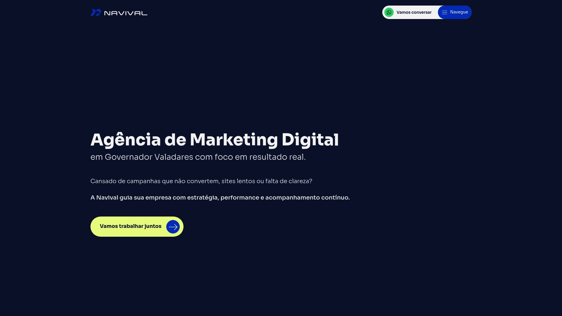 • Especialização em estratégias digitais. Navival apresenta-se como agência com know-how para desenhar planos alinhados ao mercado local de Governador Valadares.
