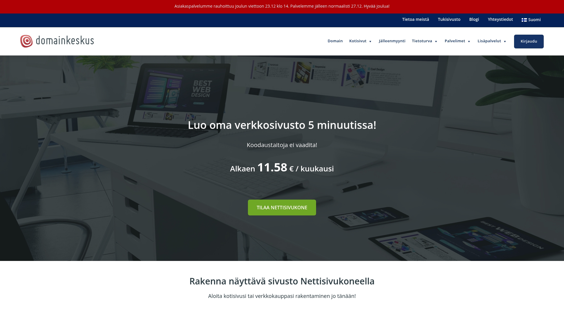 NettisivukoneVedä-ja-pudota -editori, valmis hostingHelpottaa verkkosivujen aloitusta<br>Nopea käyttöönottoEi sovellu monimutkaisiin ratkaisuihin<br>Rajoittunut muokattavuusPyydetään tarjous