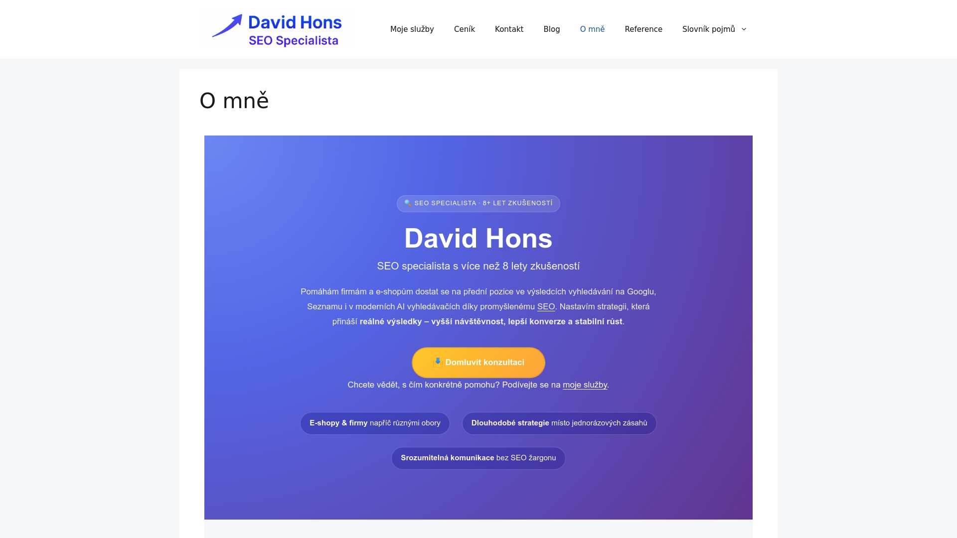 David Hons je SEO specialista s více než 8 lety zkušeností zaměřený na dlouhodobý růst e-shopů a firem. Nabízí technické SEO, on-page optimalizaci, linkbuilding a využití AI pro analýzu dat s transparentním reportingem. Shrnutí: osobní přístup, jasné cíle a orientace na obchodní výsledky; nevýhodou je chybějící veřejná cenová struktura a potenciálně delší čas do měřitelných výsledků.