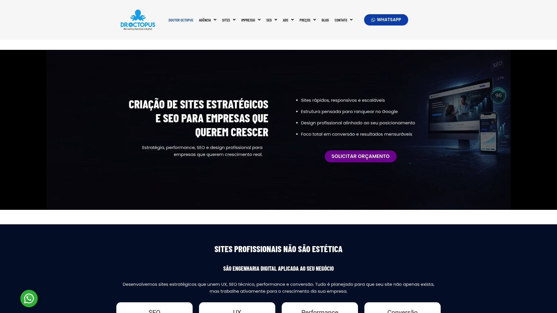 Doutor Octopus entrega sites rápidos e uma abordagem integrada de SEO, design e performance pensada para empresas que querem crescimento mensurável. O serviço combina diagnóstico técnico e estratégia para criar páginas com estrutura para ranquear no Google e converter visitantes em clientes. Está indicado para negócios dispostos a investir num ativo digital com acompanhamento contínuo. Para projetos muito simples ou orçamentos reduzidos, a proposta pode ficar fora do alcance.