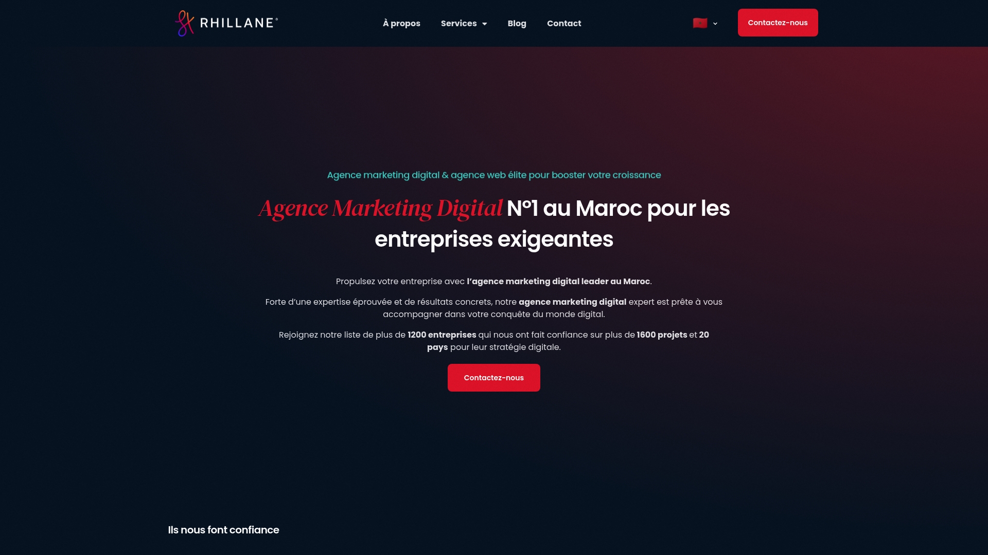Rhillane est une agence de marketing digital basée au Maroc qui propose une offre complète pour la transformation digitale des entreprises. Son point fort réside dans une offre intégrée couvrant site web, SEO, publicité et réseaux sociaux.