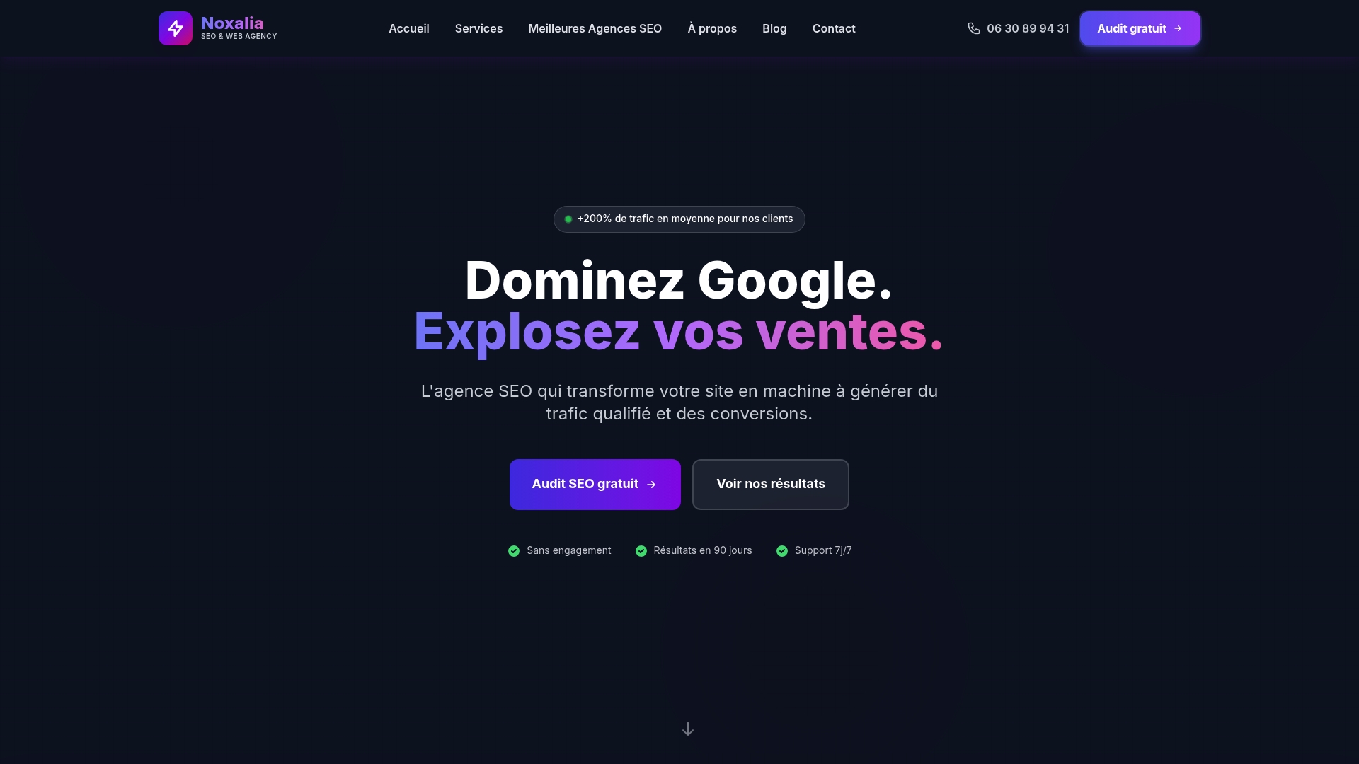 Noxalia combine audit SEO gratuit, stratégies On-Page et Off-Page personnalisées, création de site web et rédaction de contenu optimisé. Ils ajoutent suivi de performance et support analytique pour mesurer les gains et ajuster les actions.