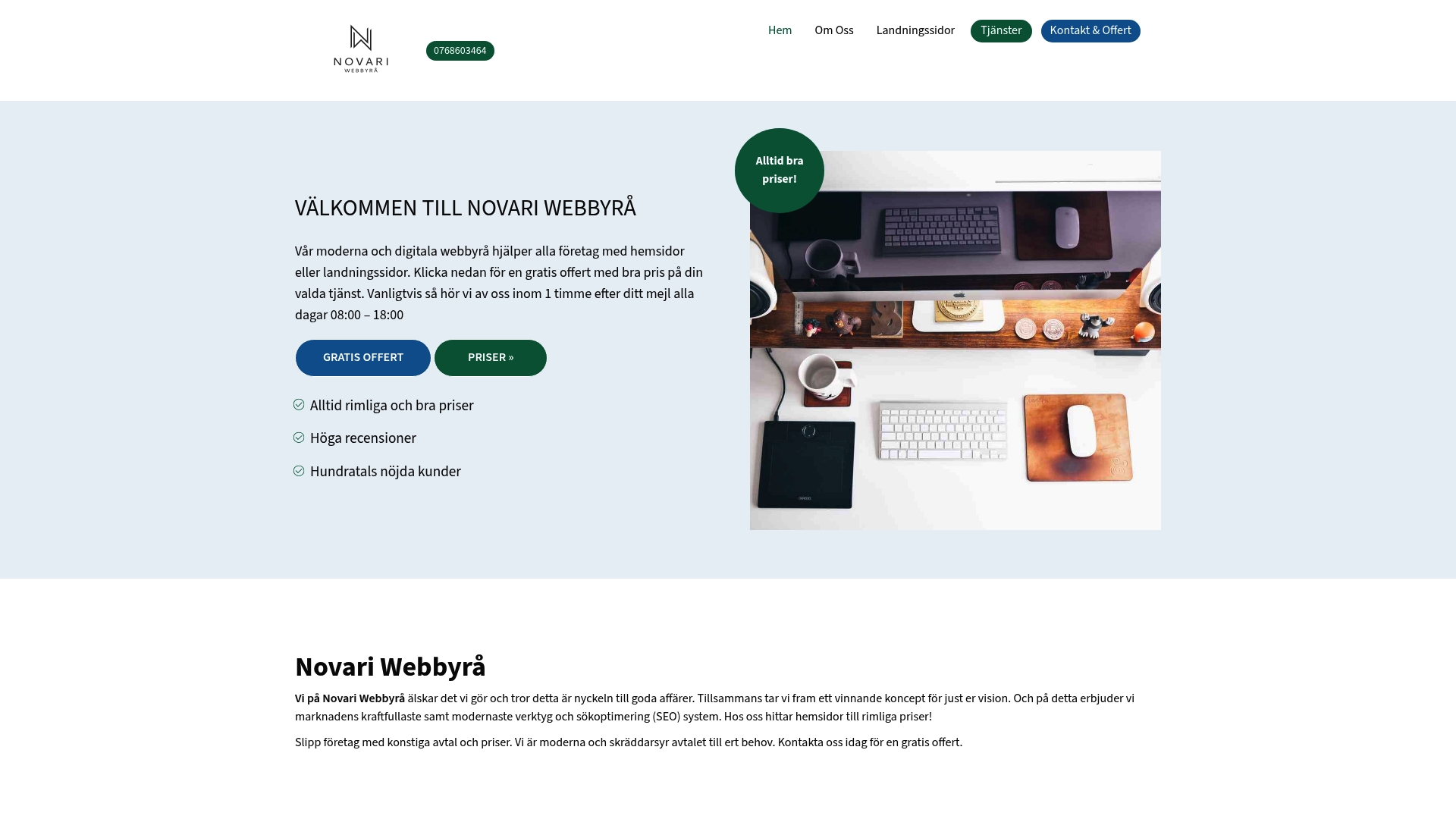 Novari levererar skräddarsydda webblösningar: design och utveckling av hemsidor och landningssidor, integration av e-handel samt grundläggande SEO-tjänster. Varje kund får en personlig kontaktperson, vilket förenklar kommunikation och uppföljning. De betonar modern kodning och flexibla avtal, samt erbjuder gratis offert och konsultation som första steg i processen.