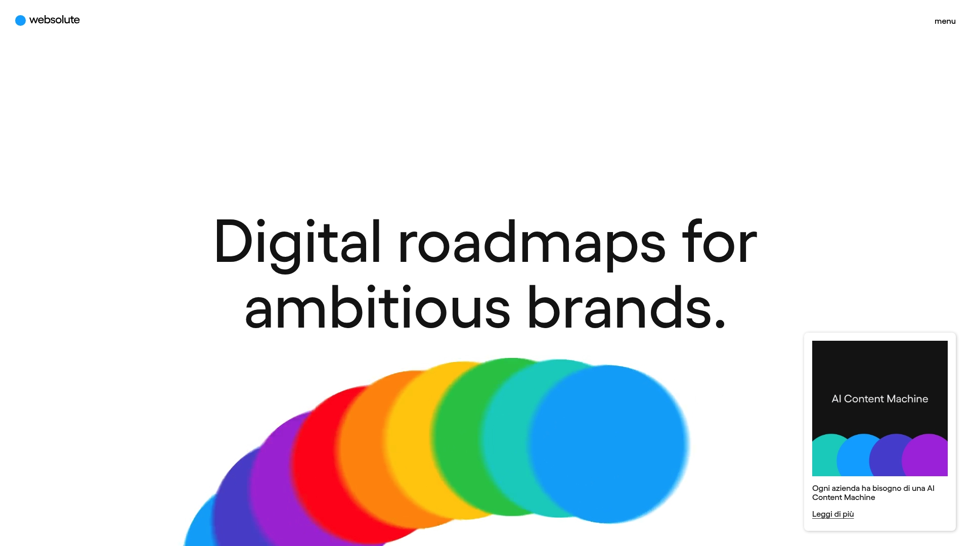 Websolute sviluppa roadmap digitali personalizzate, strategie di brand e soluzioni di demand generation con focus su social marketing. Propone piattaforme di commercio omnicanale e integra tecnologie avanzate, inclusa l'Intelligenza Artificiale e l'AI generativa, per ottimizzare processi e risultati. Il portfolio variegato dimostra capacità di lavorare su progetti complessi e di settore, unendo creatività e ingegneria tecnologica per ecosistemi digitali coerenti.