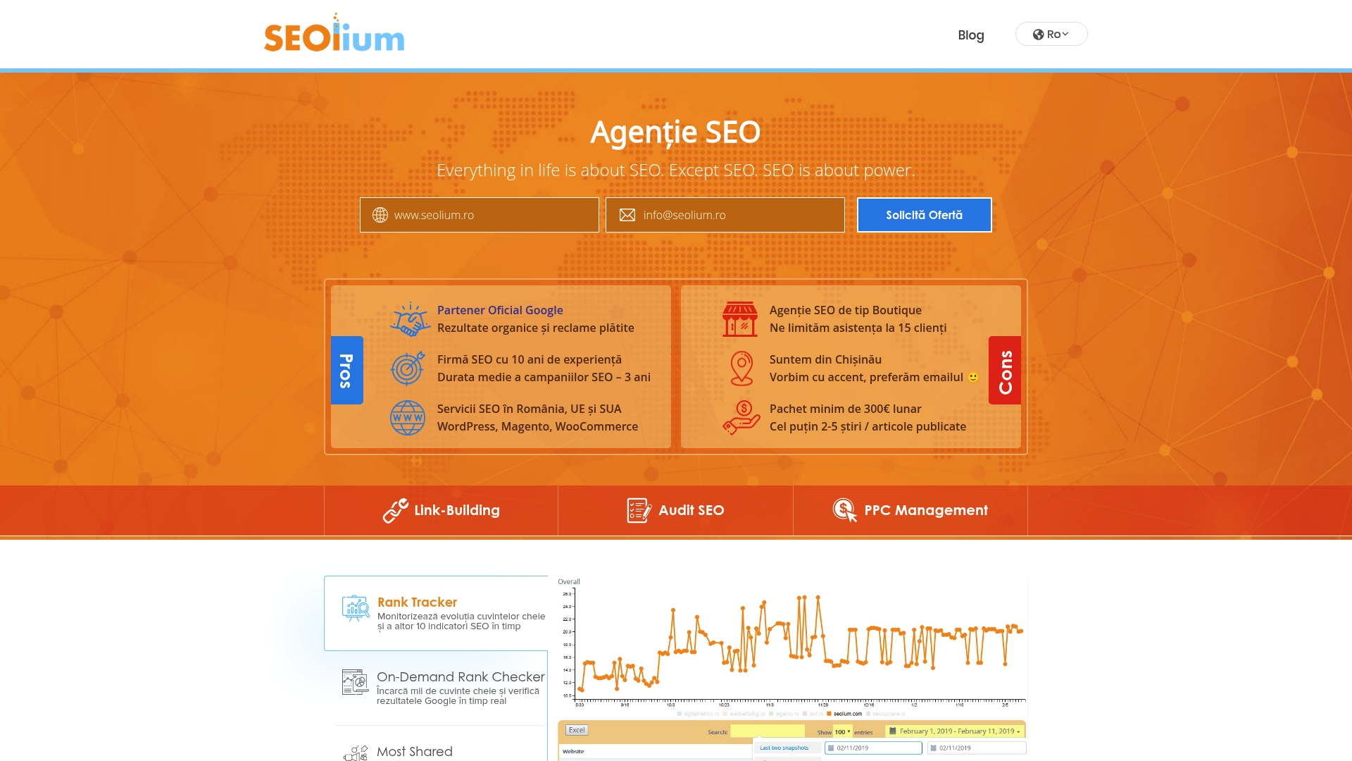 Seolium oferă management SEO și PPC integrat, un rank tracker pentru monitorizarea pozițiilor, un on-demand rank checker pentru verificări rapide, servicii de publicare conținut și articole, precum și audituri SEO și campanii de link-building. Lucrează pe platforme populare precum WordPress, Magento și WooCommerce, iar raportarea este orientată către vizibilitate și competitivitate — adică cifre clare pe care le poți raporta intern sau investitorilor.