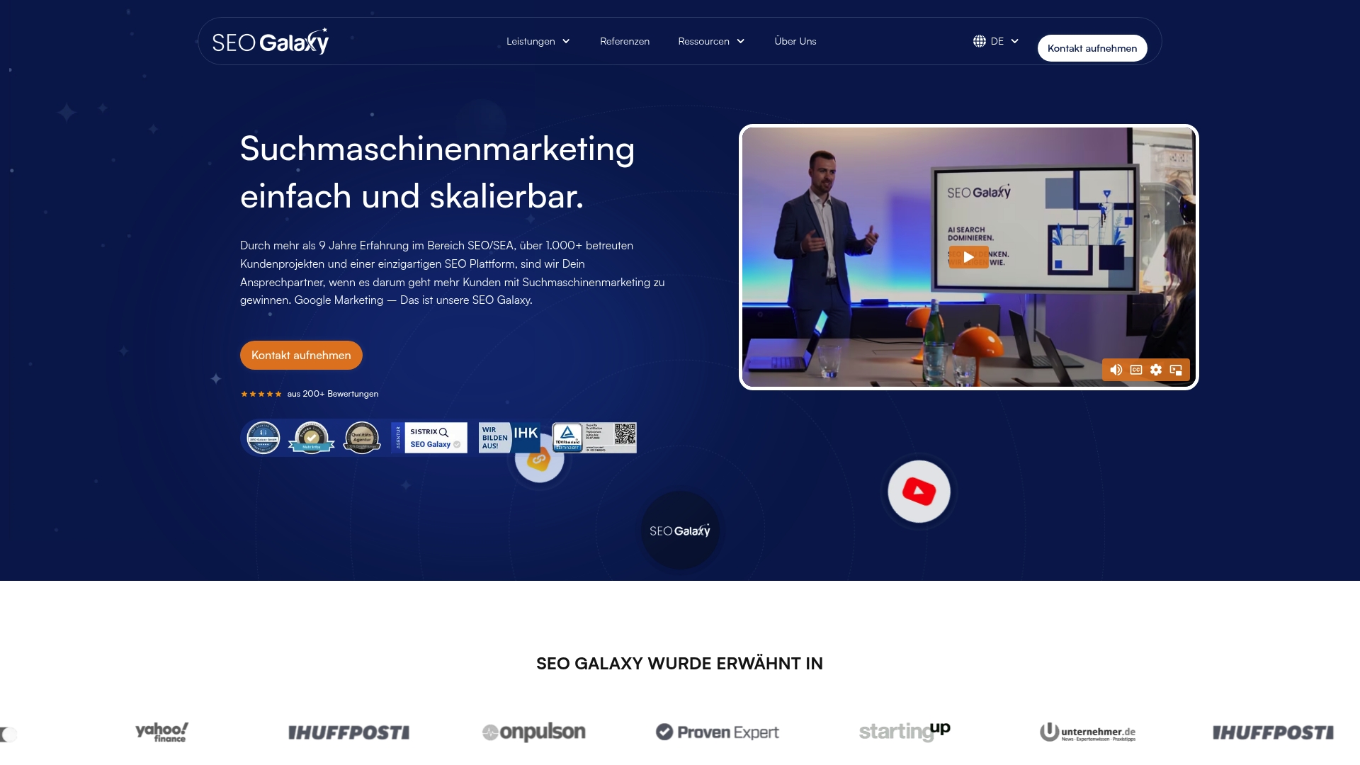 SEO Galaxy ist eine etablierte Suchmaschinenmarketing-Agentur, die seit 2016 Full-Service-Leistungen in SEO und SEA anbietet. Mit über 1.000 betreuten Kundenprojekten punktet die Agentur durch umfassende Expertise und strukturierte Arbeitsprozesse. Für kleine E‑Commerce-Unternehmer in Rostock ist SEO Galaxy leistungsstark, aber nicht immer die kosteneffizienteste Wahl — besonders wenn das monatliche Budget unter 1.000 € liegt.