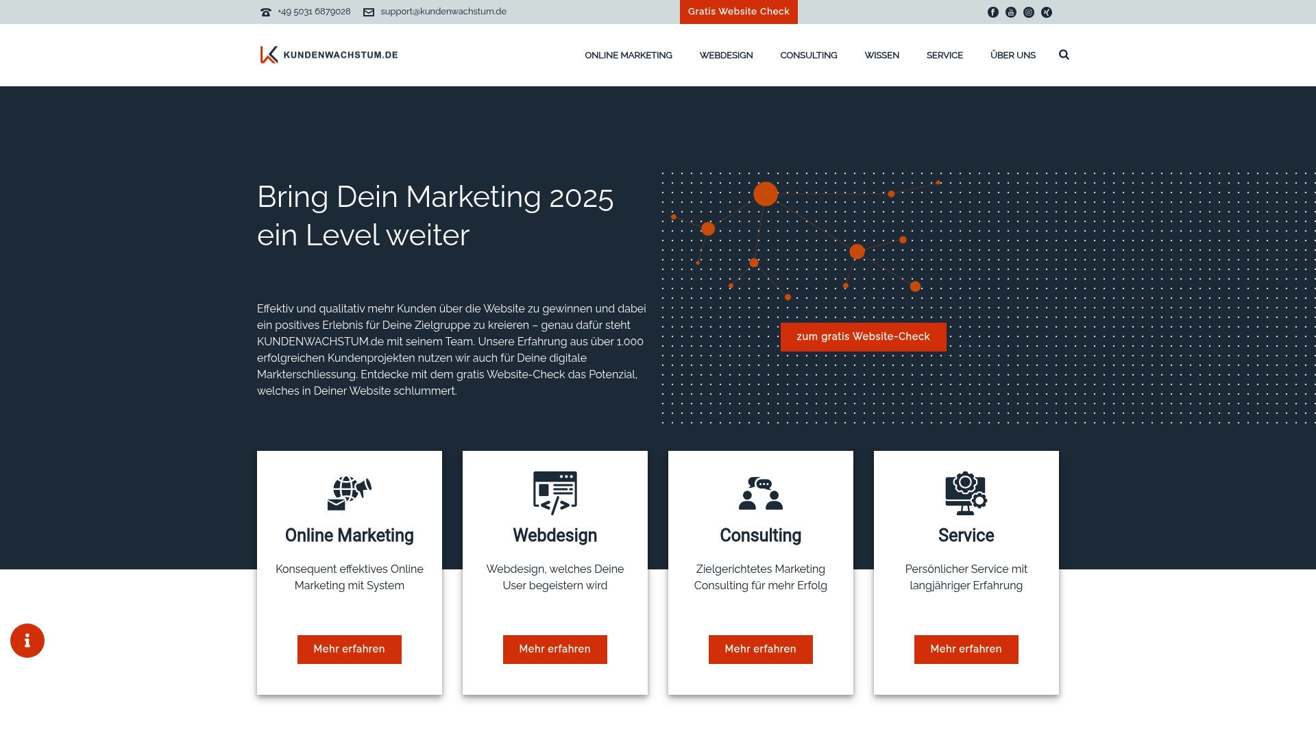 - Breites Leistungsspektrum im Online Marketing: Von Webentwicklung bis Marketing Automation deckt Kundenwachstum.de viele Disziplinen ab, sodass aus einer Hand geliefert werden kann.