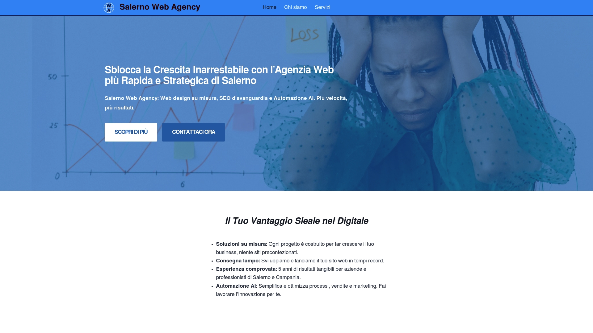 Salerno Web Agency è un'agenzia digitale locale con oltre 5 anni di esperienza che offre web design su misura, SEO avanzata e automazione per accelerare la crescita delle imprese a Salerno e in Campania. Il valore pratico per le PMI è chiaro: soluzioni personalizzate, realizzazione rapida dei siti e orientamento ai risultati misurabili. Tuttavia, alcuni dettagli operativi e di pricing restano poco trasparenti sul sito.