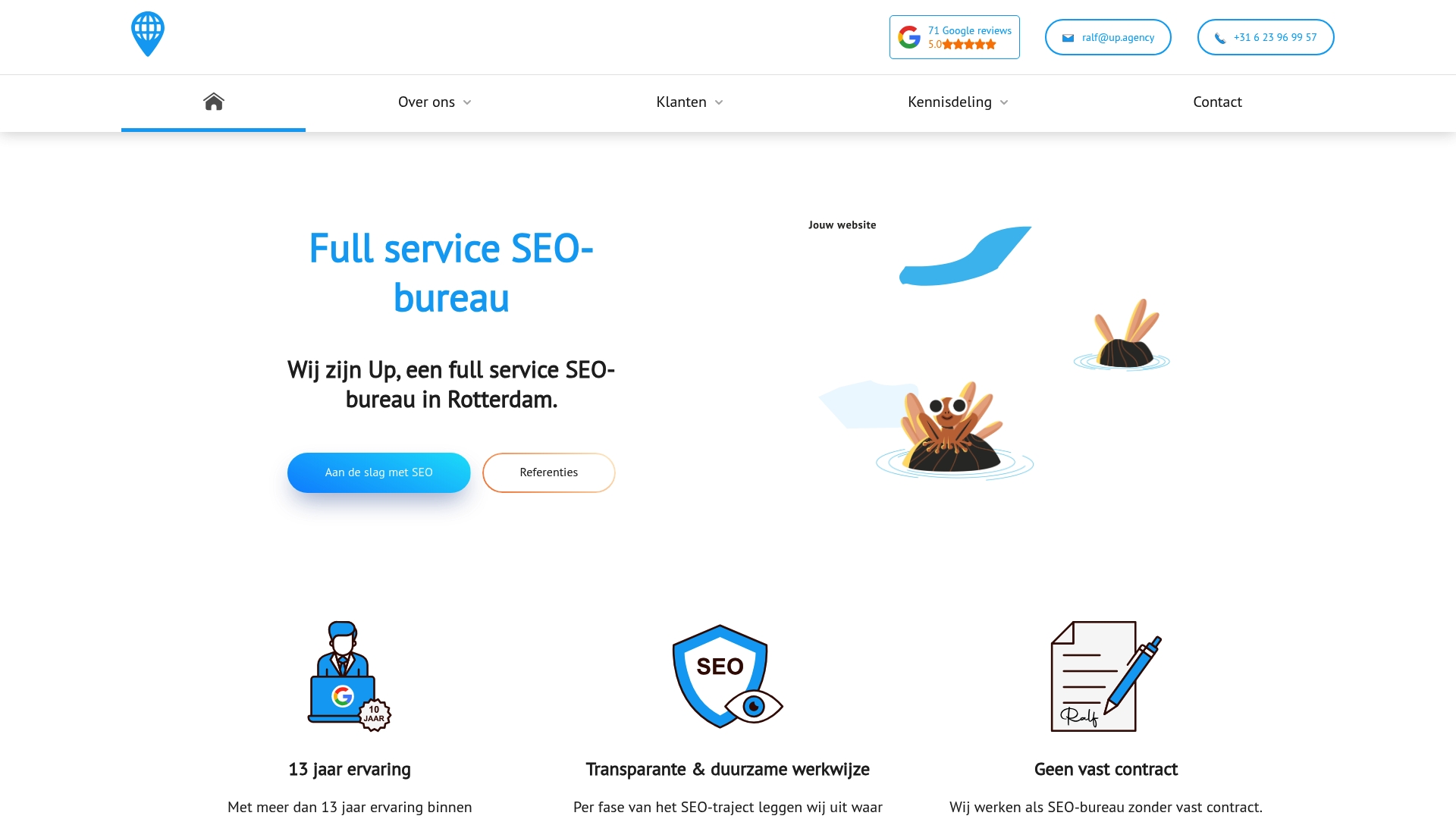 - Ruime ervaring: Met meer dan 13 jaar in SEO heeft Up Agency bewezen kennis en praktijkervaring opgebouwd die direct inzetbaar is voor complexe vraagstukken.