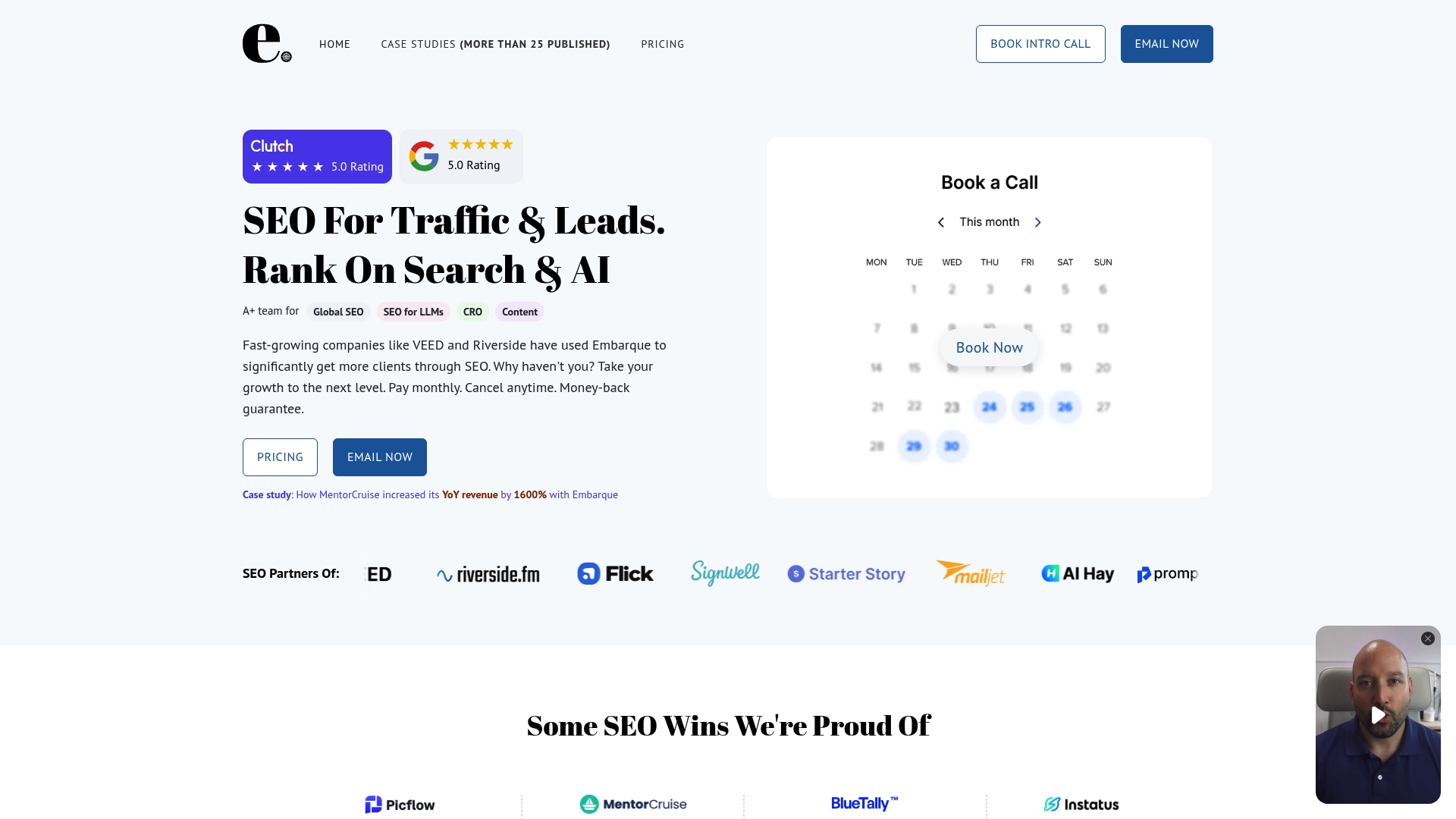 Embarque is een revenue-gedreven SEO-agency die zich richt op meetbare groei voor digitale bedrijven, met name SaaS- en AI-platforms. Ze bieden beheerde SEO-diensten—van contentcreatie en linkbuilding tot technische SEO en strategie—met maandelijkse performance-rapportages en AI/LLM-tools voor diepere inzichten. Voor groeiende ondernemingen die ROI willen koppelen aan organisch verkeer is Embarque een serieuze partner, al kunnen de tarieven voor zeer kleine start-ups aan de hoge kant voelen. De geld-terug-garantie op contentpakketten geeft bovendien extra zekerheid.