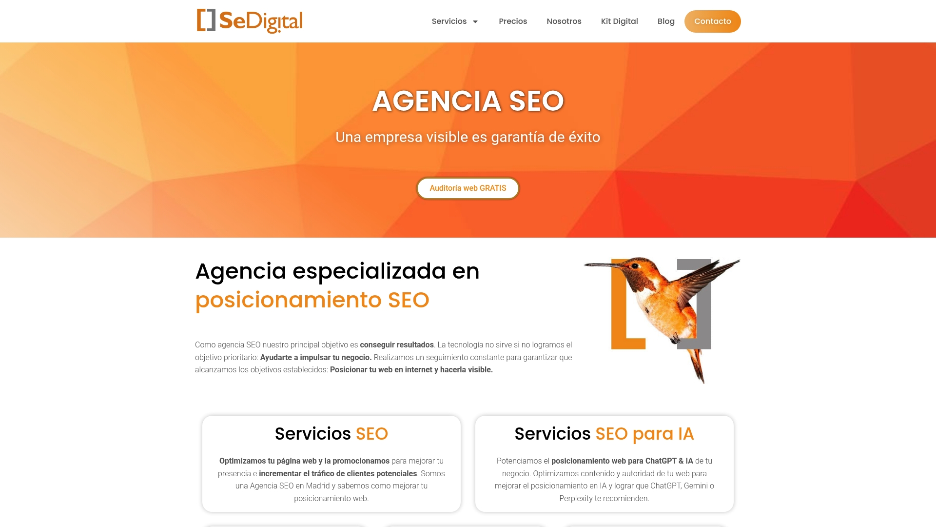 | Nosoloseo | SEO, SEM, inbound marketing, producción audiovisual; cobertura nacional en varias ciudades. | Servicios integrales y personalizados; experiencia multidisciplinar; soporte local. | Falta de precios públicos; limitada información sobre mantenimiento. | No especificado; presupuesto necesario. |