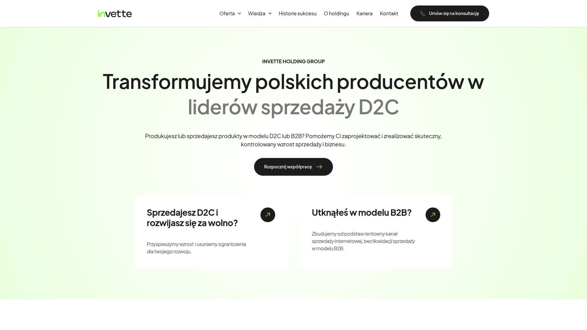 Invette Holding Group to agencja specjalizująca się w transformacji Polskich producentów w liderów rynkowych przez połączenie strategii, wdrożeń e‑commerce i ekspansji zagranicznej. Ich podejście łączy audyt, implementację systemów i operacyjne zarządzanie sprzedażą, co sprawia, że klient otrzymuje kompleksowy plan wzrostu. Mocne strony to nastawienie na ROI i udokumentowane sukcesy z realnym wzrostem przychodów. Wymaga zaangażowania klienta i odpowiedniego budżetu — więc nie jest to rozwiązanie „plug-and-play”.