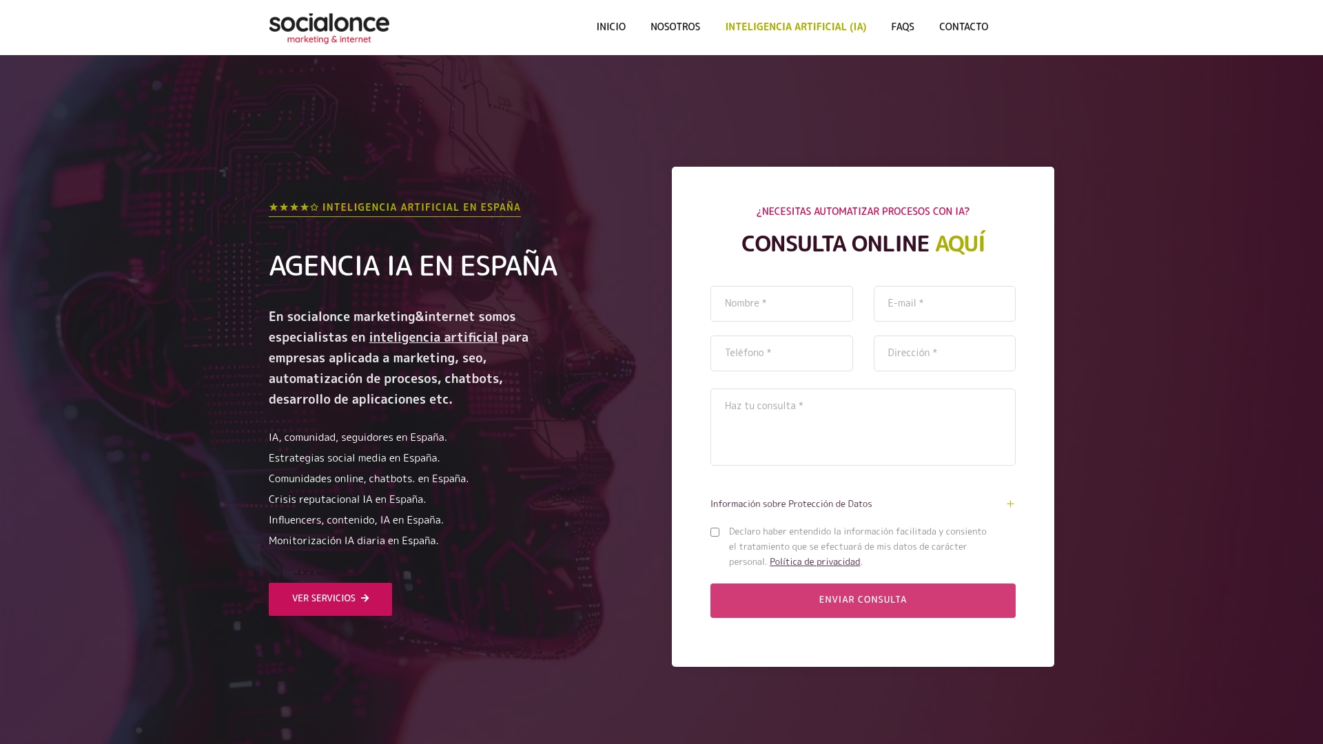 Agencia IA en EspañaConsultoría de proyectos IA, automatización avanzada, cumplimiento normativo y seguridad.Enfoque en resultados empresariales concretos, cobertura nacional con opciones locales.Precios no públicos, orientada a empresas con mayor capacidad presupuestaria.No especificado.