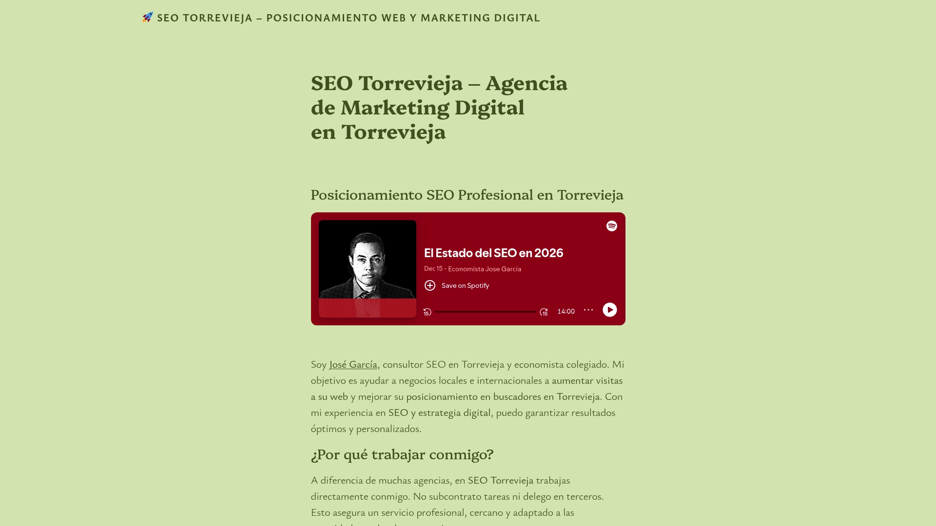 SEO Torrevieja es una consultoría local dirigida por José García que ofrece estrategias de posicionamiento web y marketing digital centradas en resultados para negocios en Torrevieja. Su enfoque es directo: comunicación personal con el consultor, sin subcontratación, lo que facilita decisiones rápidas y ajustes personalizados. Funciona bien si buscas atención uno a uno y acciones técnicas concretas; sin embargo, la falta de precios públicos y la incertidumbre sobre la escalabilidad pueden obligarte a solicitar una consulta antes de decidir.