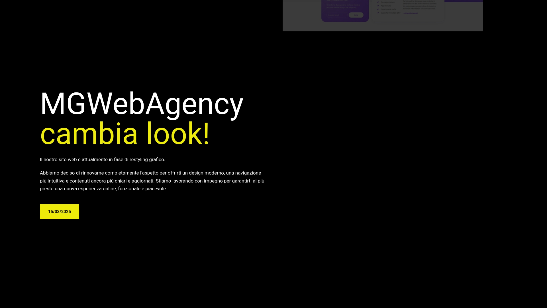 MG Web AgencySito in ristrutturazione con focus su design moderno e navigazione intuitivaMiglioramento dell'esperienza utente, contenuti aggiornatiSito attualmente non disponibile, rischio di ritardo nella ristrutturazioneNon specificato