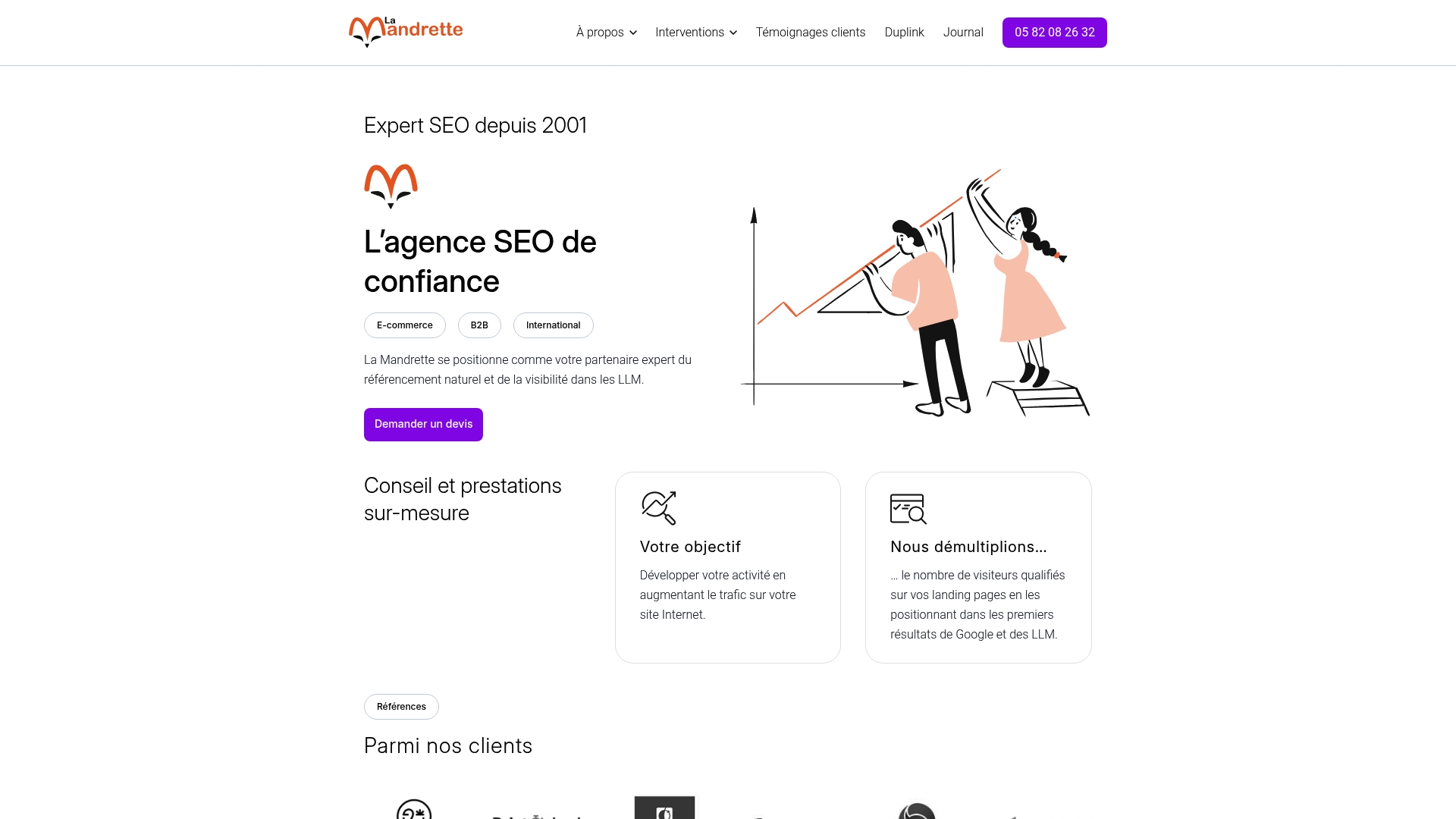 La Mandrette propose une agence SEO expérimentée qui combine 20 ans d'expérience et une spécialisation dans la visibilité pour les assistants conversationnels. Elle convient aux PME qui veulent une stratégie solide et un accompagnement sur le long terme.