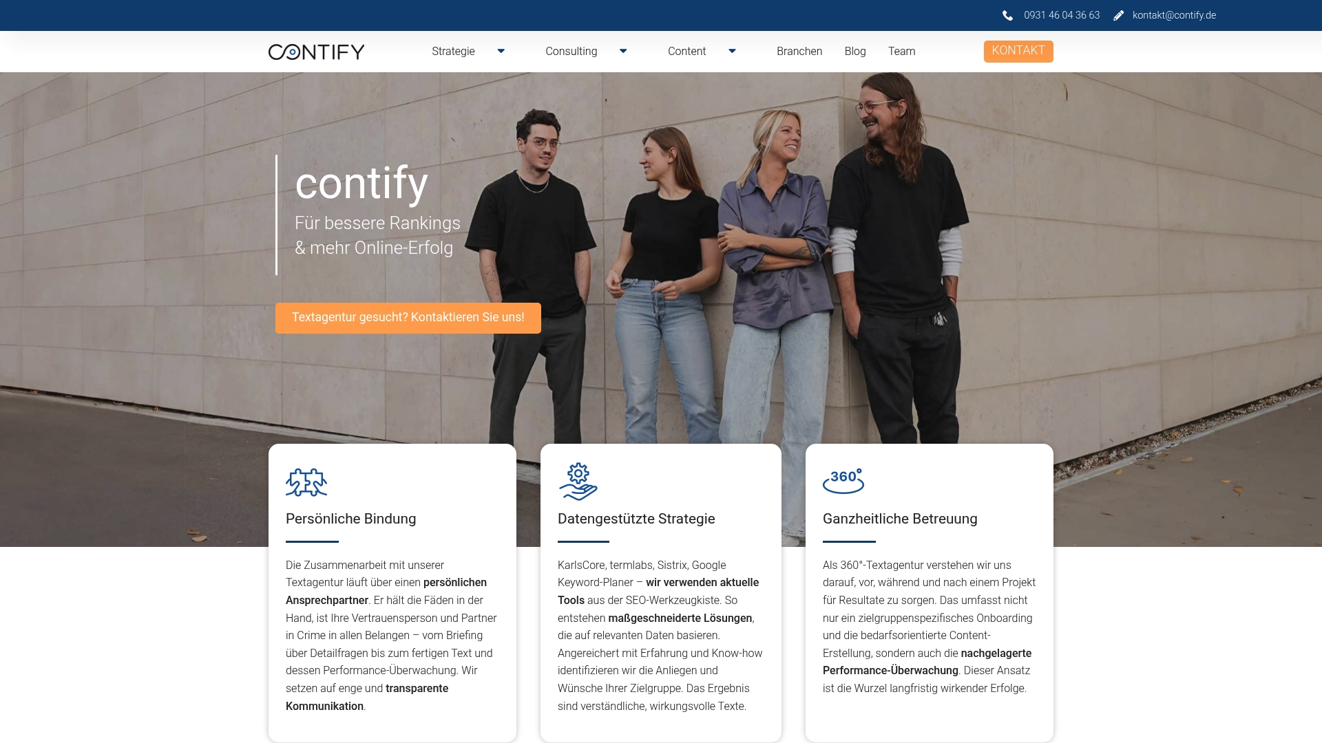 Contify ist eine Textagentur, die sich auf nachhaltigen, suchmaschinenfreundlichen Content mit persönlicher Betreuung spezialisiert hat. Die Agentur kombiniert datenbasierte Keyword-Analysen mit einem transparenten Workflow und bietet Leistungen von SEO-optimierten Texten bis zu Übersetzungen an. Kurz: Gut strukturiertes Content-Angebot für Unternehmen, die langfristige Sichtbarkeit und Performance suchen. Ein klarer Fokus auf Qualität — aber weniger auf standardisierte Preistransparenz.