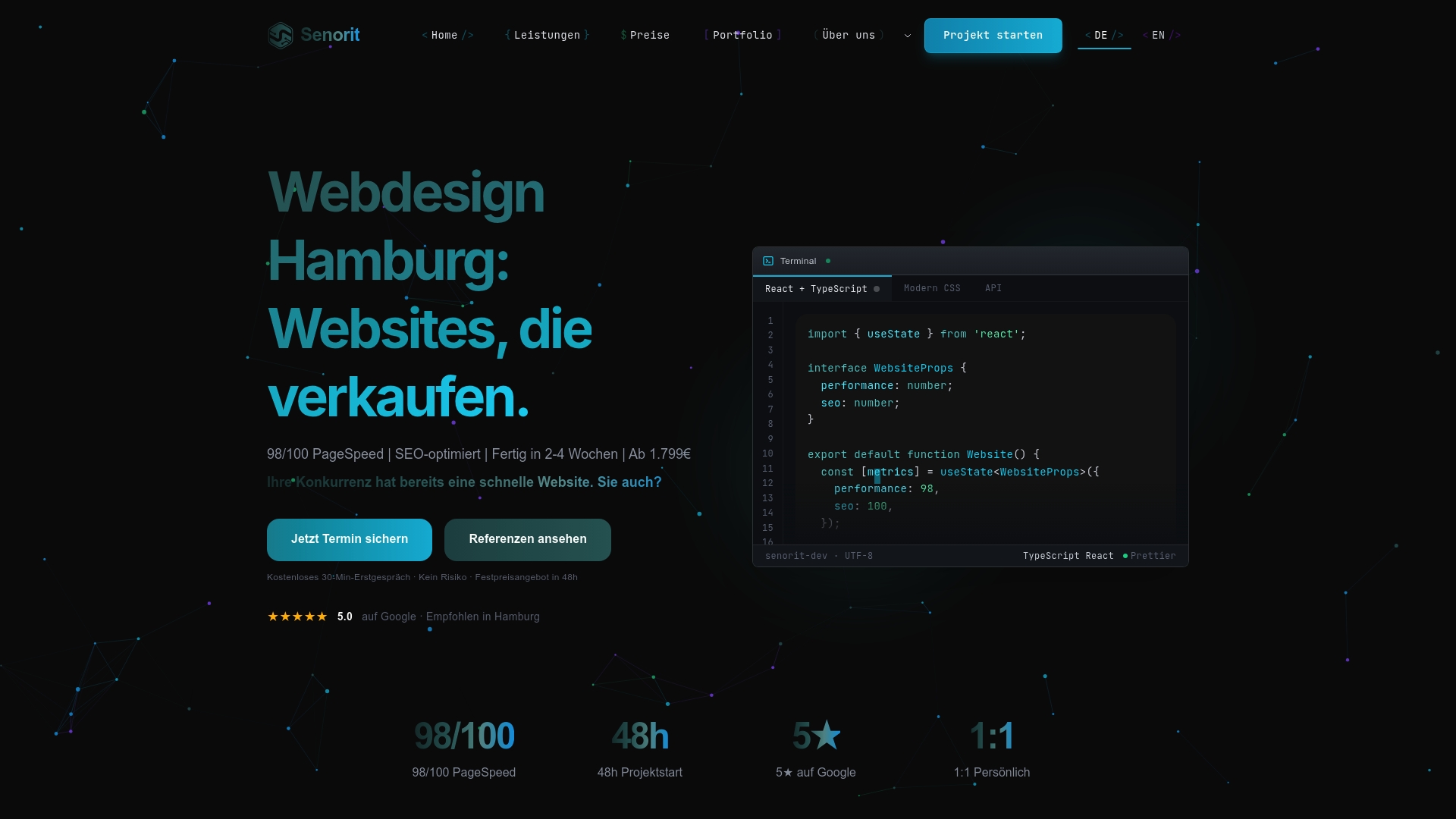 Senorit kombiniert SEO-optimiertes Webdesign mit einem PageSpeed 98/100 Ergebnis und einem Mobile-first Design. Die Agentur bietet individuelle, responsive Designs und setzt auf React, Next.js und TypeScript für Performance und Sicherheit.
