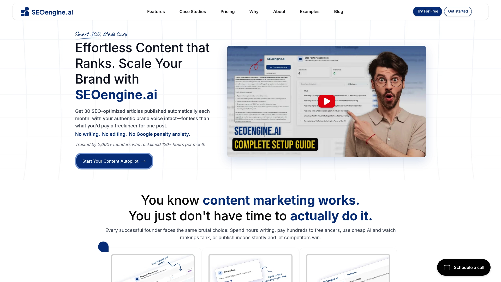 - Zeitersparnis: Laut Anbieter spart SEOengine.ai über 120 Stunden pro Monat bei der Content Produktion, sodass Sie Personalressourcen auf andere Aufgaben lenken.