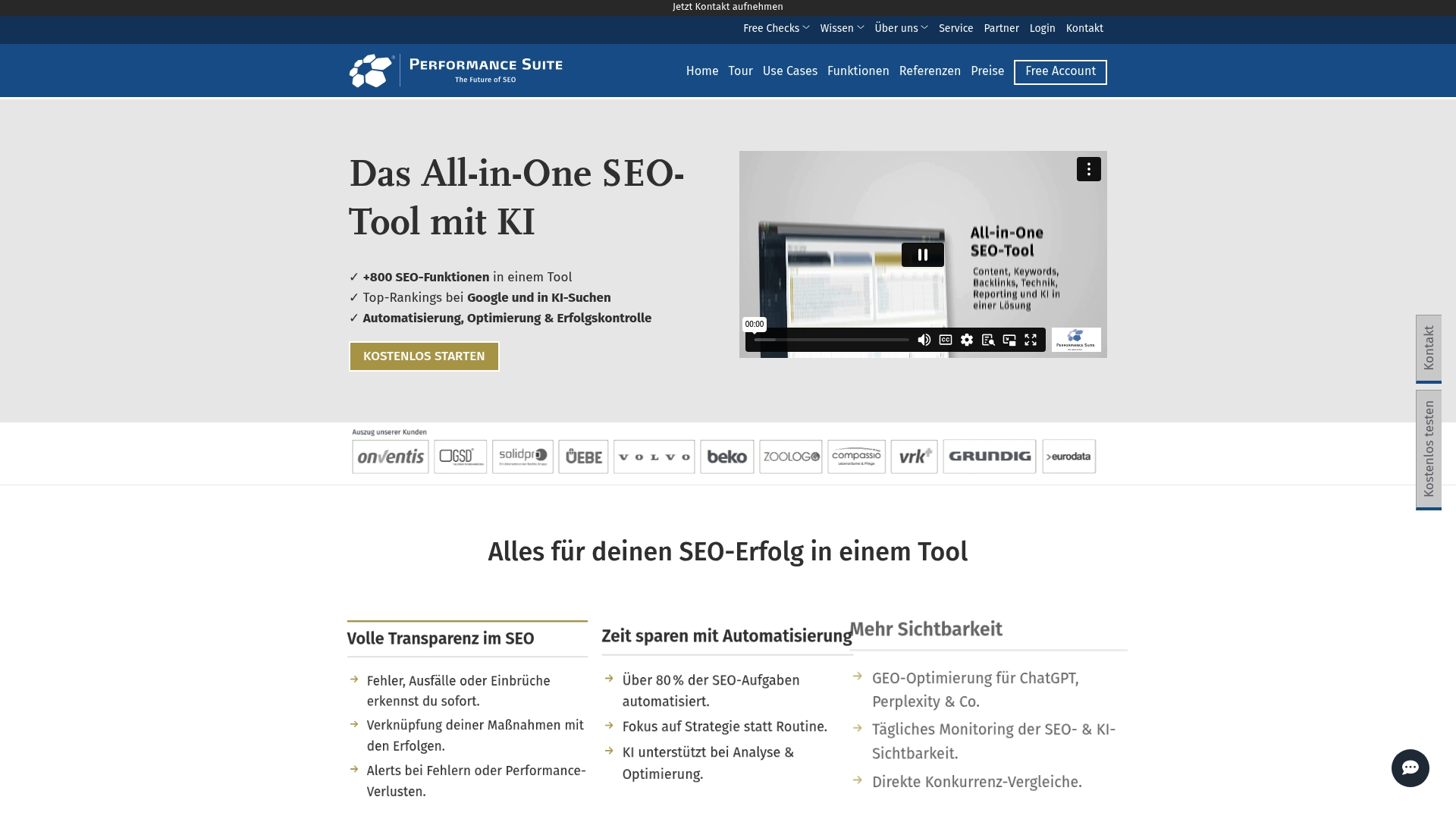 Die Suite sammelt alle relevanten SEO-Daten an einem Ort und führt automatisierte Technik-Checks durch. Sie bietet Content-Optimierung für Suchmaschinen und generative KI, ein Backlink-Management samt Analyse sowie Echtzeit-Monitoring und Reporting zur Performancekontrolle.