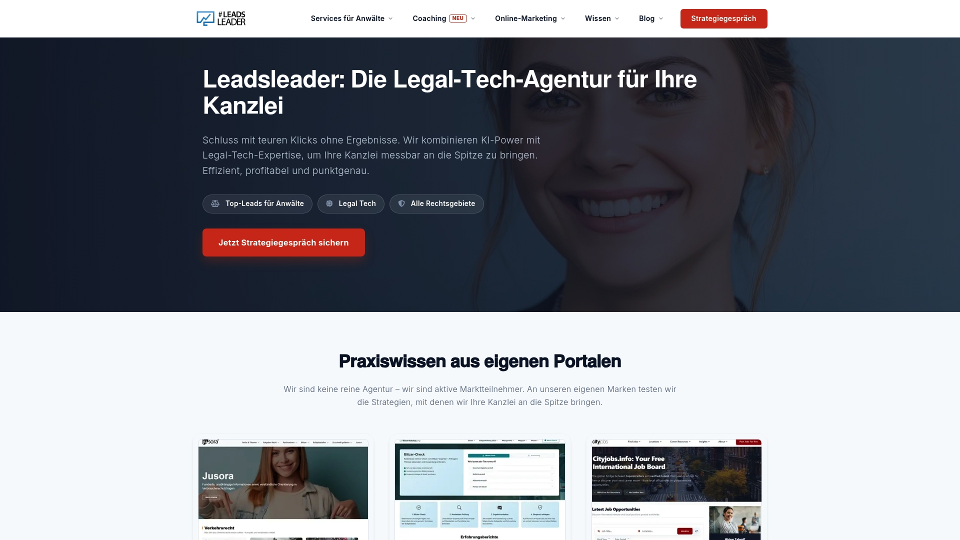 Leadsleader liefert Performance-Marketing für Kanzleien, SEO-Optimierung und Google Ads mit KI-Power wie Performance Max. Zusätzlich bietet die Agentur KI-gestützte Positionierung in AI Overviews und testet Strategien über eigene Legal-Tech-Portale wie Jusora, Blitzerkatalog und Cityjobs.