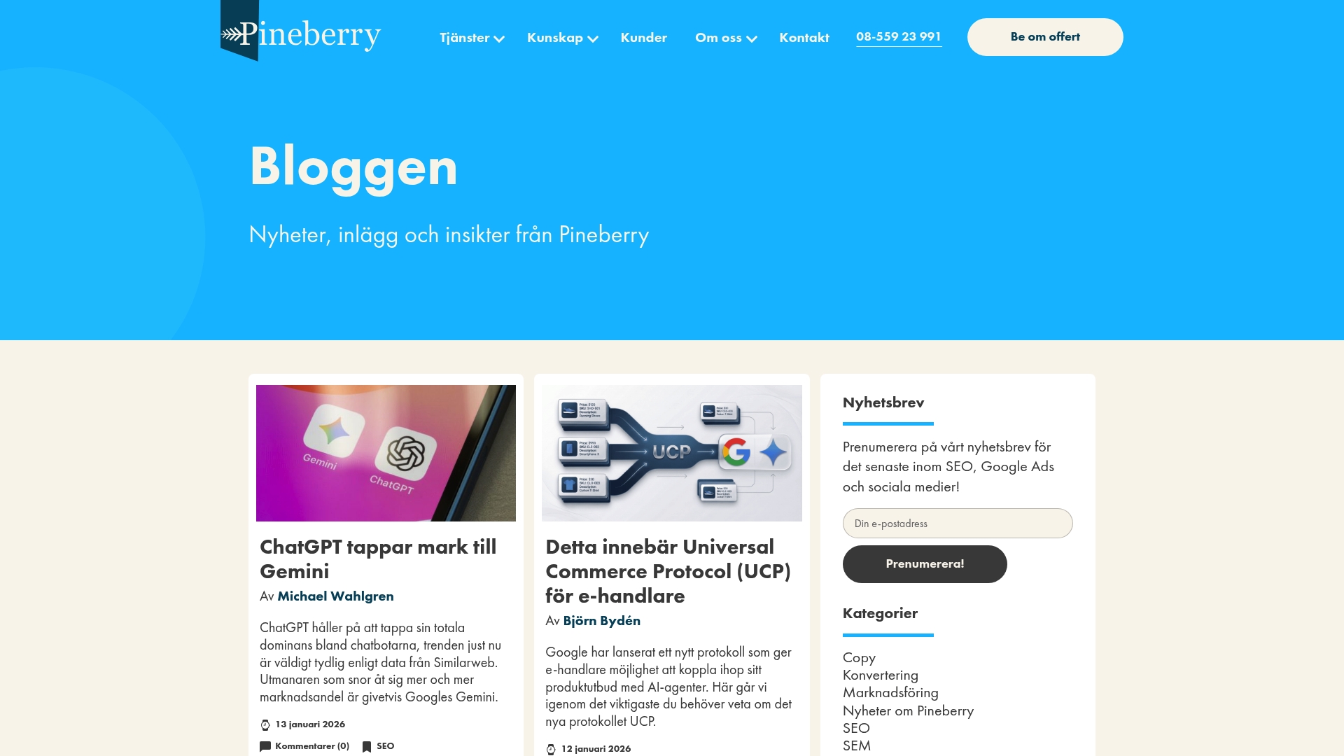 Det unika med Pineberry är kombinationen av konsulttjänster och utbildningsinnehåll – du får både hjälp att lösa konkreta marknadsföringsproblem och verktyg för att bygga intern kompetens. Den kontinuerliga publiceringen av insikter stärker också deras roll som kunskapspartner, inte bara leverantör.