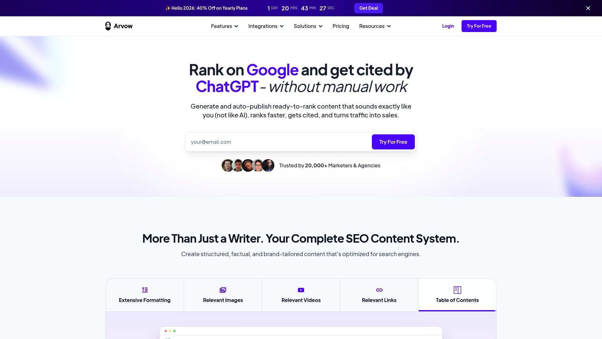 Arvow erbjuder flera integrerade verktyg för hela innehållscykeln. Det inkluderar AI Article Writer, verktyg för att omvandla video till blogginlägg och en nyhetsförfattare. Plattformen innehåller också Automation tools som AI SEO Agent, Autoblog, SEO Reports och Visibility Tracker som kontinuerligt mäter resultat. Styrkan ligger i omfattande Integrations med WordPress, Shopify, Wix, Webflow, Blogger, Ghost, Zapier och Squarespace samt möjligheten att koppla via API och Webhooks.