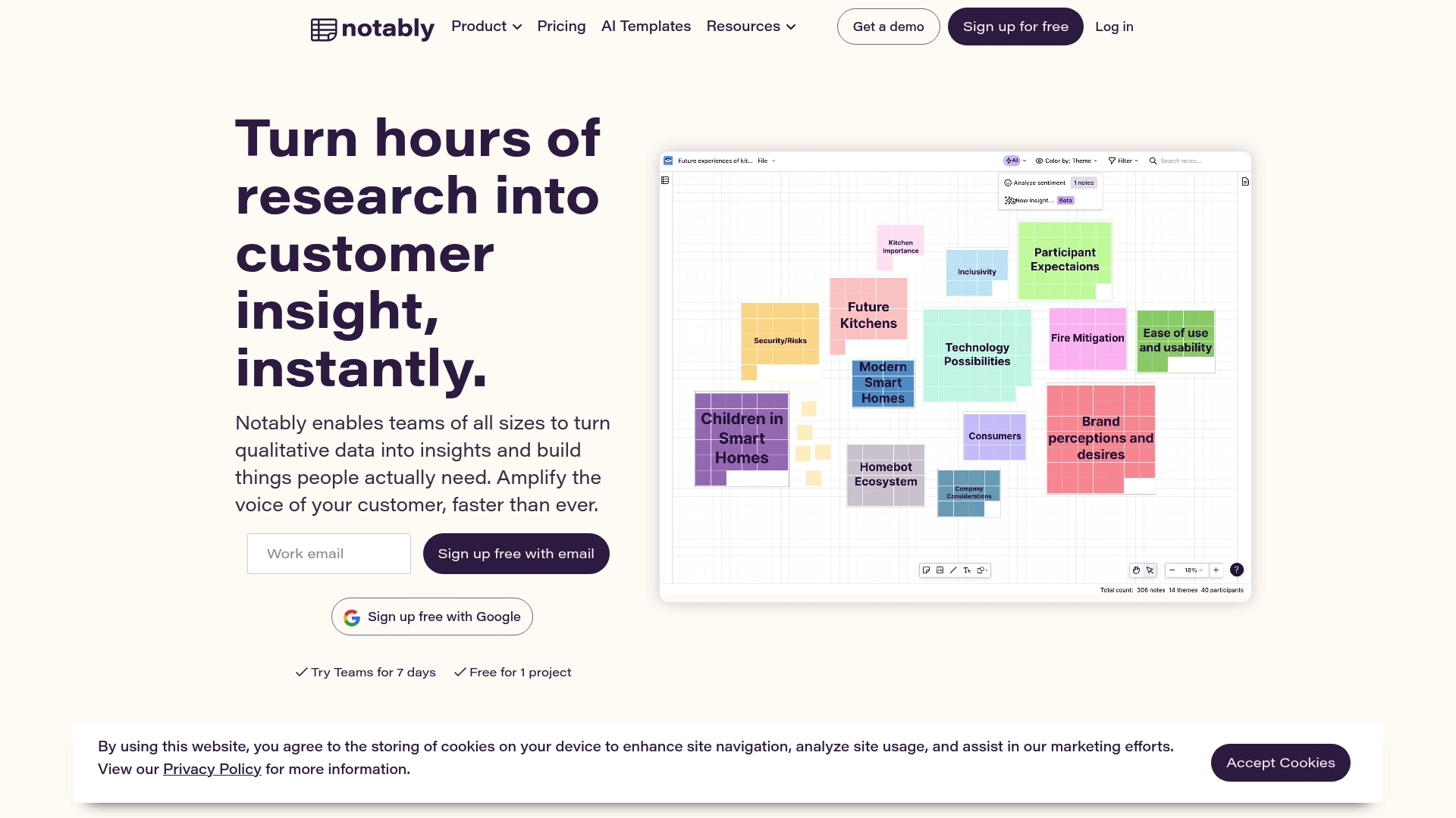 Notably combines a Research Repository with AI Research tools to analyze interviews and notes across project stages. Key capabilities include video transcription, cluster analysis, digital sticky notes, and customizable templates for insight reporting. The platform supports team collaboration and secure storage with encryption and single sign on. Integrations reduce friction when pulling data from common meeting and storage tools.