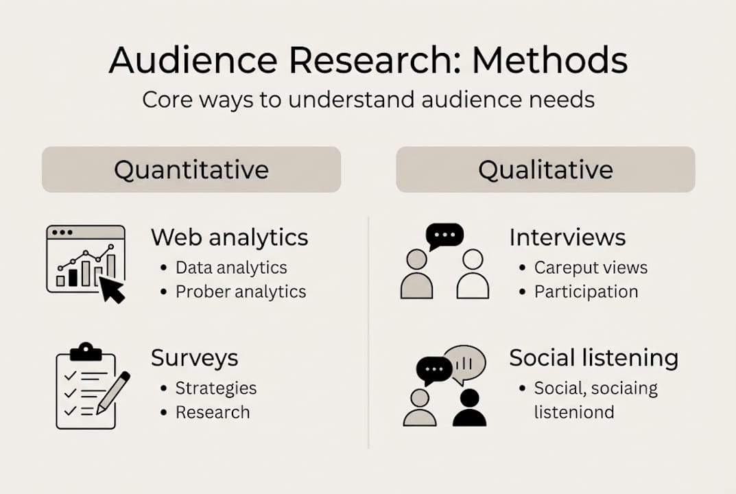 There's no single method that gives you the full picture. The most accurate audience understanding comes from combining quantitative data with qualitative insight. Think of it as triangulation: each method fills in the blind spots of the others.