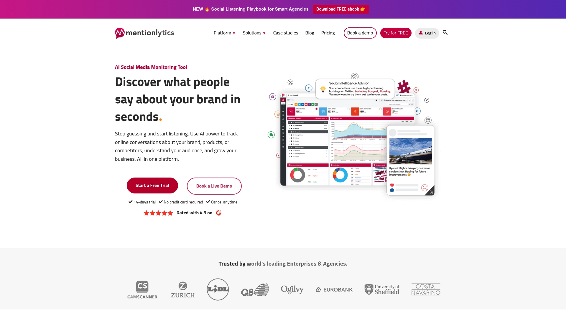 Το Mentionlytics είναι μια πλατφόρμα παρακολούθησης κοινωνικών δικτύων και διαδικτύου που αξιοποιεί AI-driven ανάλυση συναισθήματος και ομαδοποίηση αναφορών για να δώσει αποτελέσματα σε brands και agencies. Η πλατφόρμα συγκεντρώνει αναφορές από ειδήσεις, blogs, φόρουμ και δημοφιλή social media και μετατρέπει τον όγκο δεδομένων σε λειτουργικά insights. Ιδανική για διαχείριση φήμης και παρακολούθηση καμπανιών. Το βασικό μειονέκτημα είναι η στενή εστίαση στο listening που μπορεί να αφήσει κενά σε άλλες περιοχές marketing.
